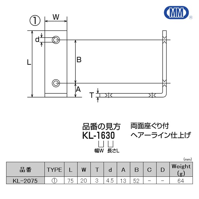 ●TYPE:① ●L(mm):75 ●W(mm):20 ●T(mm):3 ●d(mm):4.5 ●A(mm):13 ●B(mm):52 ●Weight(g):64 ●材質:ステンレス(SUS304)