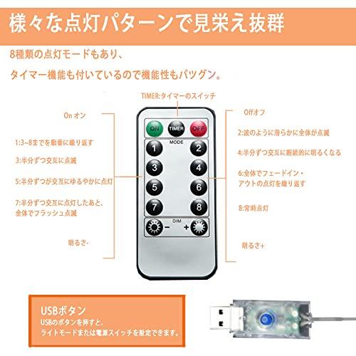 ☀【8種類のパターンがある、飽きにくいイルミネーション】6時間タイマーが設定できるため、うっかり電源を切り忘れても安心です。「TIMER」のボタンを押すと、自動的に6時間タイマーが設定されました。ライトは6時間後に自動的にオフになります。リモコンがついているので、タイマー設定のほか、8種類ある点灯パターンを選んだり、明るさを調節したりするのも簡単にできます。