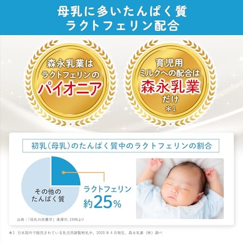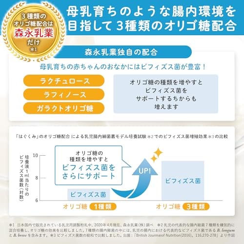 【特長2】初乳に多く含まれ、ビフィズス菌のような良い菌を守る「ラクトフェリン」、母乳育ちのような腸内環境に近づける、3種類のオリゴ糖を配合しています。オリゴ糖の種類を増やすと、赤ちゃんのおなかのビフィズス菌もさらに増えます。育児用ミルクにラクトフェリン・3種類のオリゴ糖を配合しているのは、森永だけ。日本国内で販売されている乳児用調製粉乳中、2020年4月現在 森永乳業㈱調べ