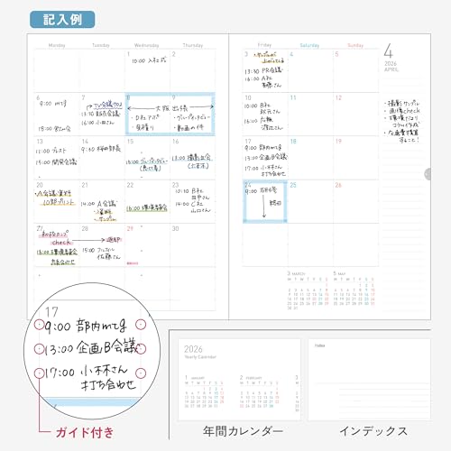 【編集内容】 インデックス・年間カレンダー・イヤープランナー・月間カレンダー(見開き1カ月・ブロック式)・方眼罫ノート121ページ