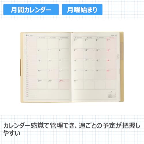 【商品詳細】サイズ:188mm × 133mm × 15mm / ページ数:208 / 月曜始まり / レイアウト:月間カレンダー + 週間ブロック / 用紙色:ホワイト用紙 / 掲載資料(本冊):日本白地図・世界白地図・ID・PWリスト・ヘルスチェックカレンダー・ヘルスチェックメモ・マンスリープラン・プランリスト・年齢早見表・ログリスト 掲載資料(分冊):-
