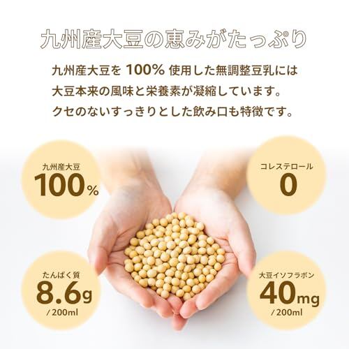 九州産大豆を100%使用した無調整豆乳には大豆本来の風味と栄養素が凝縮しています。クセのないすっきりとした飲み口が特徴です。大豆を湯通ししてから磨砕するこだわり製法。飲用だけでなく料理にもご利用頂けます。パスタやスイーツ等いつもの料理に豆乳を加えるだけで美味しさアップ。ノンコレステロール。