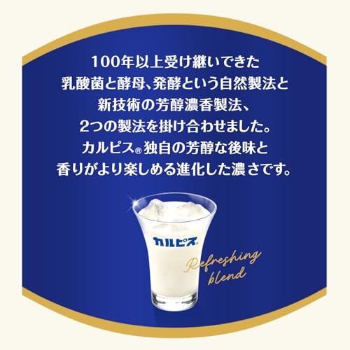 伝統と革新が融合した、濃いめのカルピス(R) カルピス(R)独自の芳醇な後味と香りを強化した、濃いめのカルピス(R)です。 100年以上受け継いできた乳酸菌と酵母、発酵という自然製法に、新技術の芳醇濃香製法を掛け合わせて実現しました。 忙しい毎日に安らぎと前向きな気分をもたらす、濃くて爽やかな味わいです。