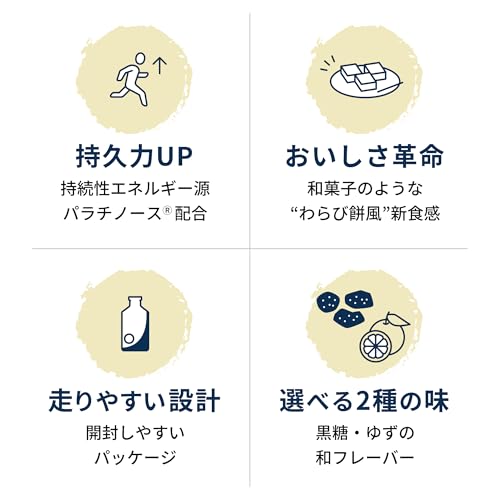 【美味しさと機能性の両立】わらび餅風の食感と持続性エネルギー源のパラチノース配合でエネルギーチャージ。甘さ控えめなのでマラソンやトレイルランのレース中でも美味しくお召し上がりいただける栄養補給食です。