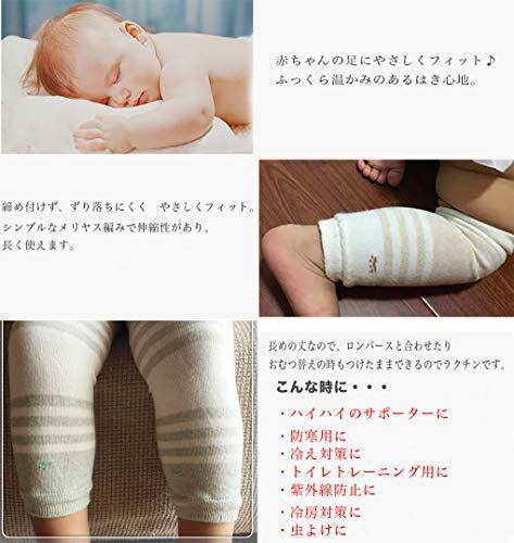 3ヶ月から24ヶ月の赤ちゃんに対応し、防寒や冷え対策に役立ちます。また、膝当てとしても機能し、擦りむき防止にも効果的です。