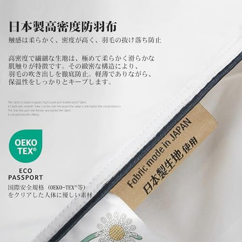 【日本製高密度防羽布】肌に触れる側は高密度で織られた柔らかい綿生地。サラッとした肌ざわりと通気性で、蒸れずに快適。羽毛の抜け漏れも防ぎます。